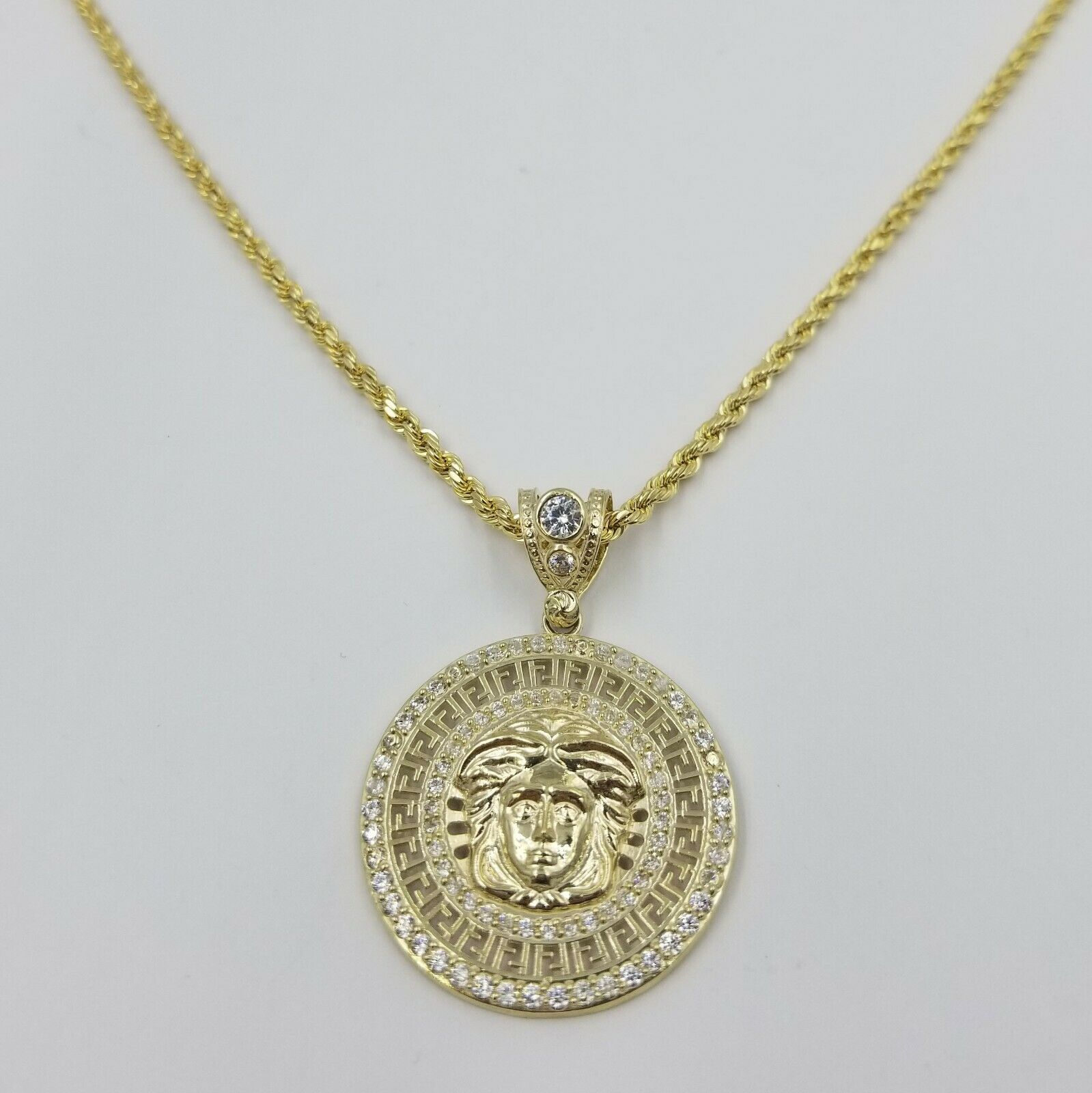 Medusa Head Gold Pendant with 3mm Rope Chain in various lengths. The Length of the charm is 1.75 inch approx. The Weight on the charm is (5.5 - 6.2) Grams approx. The Length of The Chain are 20", 22", 24" Inches with the width of 3mm. Please feel free to contact us if you have any queries regarding the item!